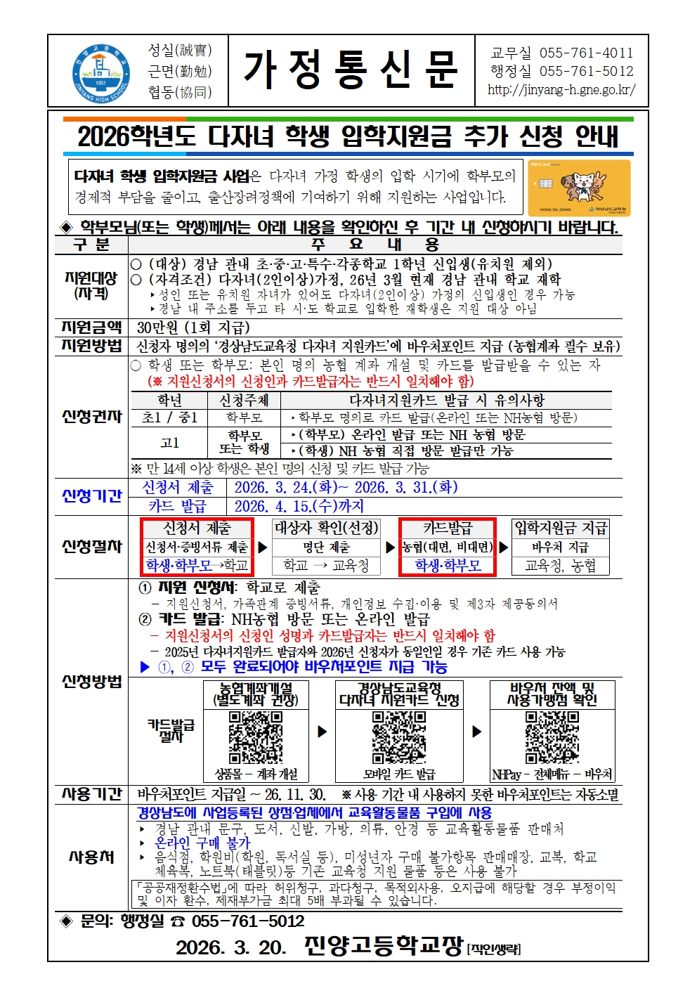2026학년도 다자녀 학생 입학지원금 지원와 관련하여, 아래와 같이 추가 신청을 받으니 해당되시는 분들께서는 기한 내 신청하여 주시기 바랍니다.