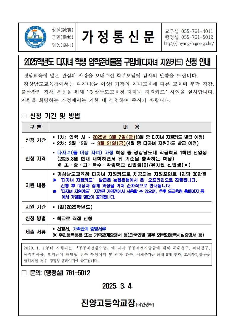 2025학년도 다자녀 학생 입학준비물품 구입비(다자녀 지원카드) 지원 신청 안내